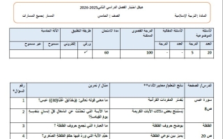 جدول المواصفات التفصيلي للامتحان النهائي التربية الإسلامية الصف الخامس الفصل الدراسي الثاني 2025-2026